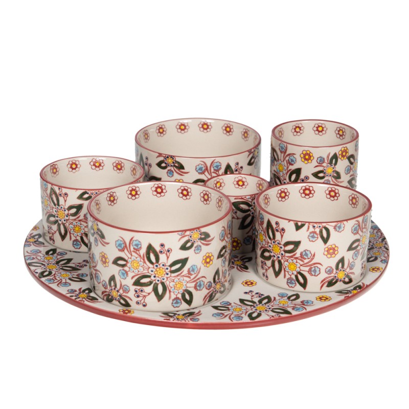 Le service apéritif en grès de la gamme Siena signé Table Passion apporte une touche de charme méditerranéen à vos moments de convivialité. Réalisé en grès de haute qualité, il séduit par sa robustesse et son élégance artisanale. Ses motifs floraux délicatement colorés et ses finitions soulignées d’un liseré rouge évoquent le savoir-faire traditionnel des céramiques italiennes. Composé de plusieurs coupelles assorties disposées sur un grand plateau, ce service est idéal pour présenter vos amuse-bouches, sauces, olives ou autres délices à partager. Pratique et esthétique, il s’intègre parfaitement à toutes les tables, qu’elles soient modernes ou plus classiques. Résistant et facile d’entretien, le service apéritif Siena passe au lave-vaisselle et au micro-ondes, alliant ainsi style, fonctionnalité et durabilité.