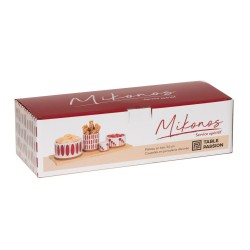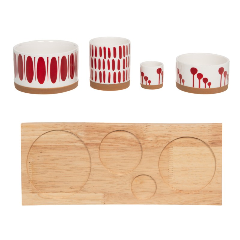 Set apéritif 4 pièces 'Mikonos' signée TABLE PASSION, composé de 4 coupelles céramique décor rouge sur base argile et d'un plateau en bois clair. Design coordonné à motifs graphiques, adapté à la présentation d'amuse-bouches et condiments en restauration ou vente d'accessoires table. Article photo-friendly, empilable et peu encombrant, facilite la mise en scène en magasin. Idéal pour compléter une gamme vaisselle contemporaine et thématique.