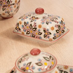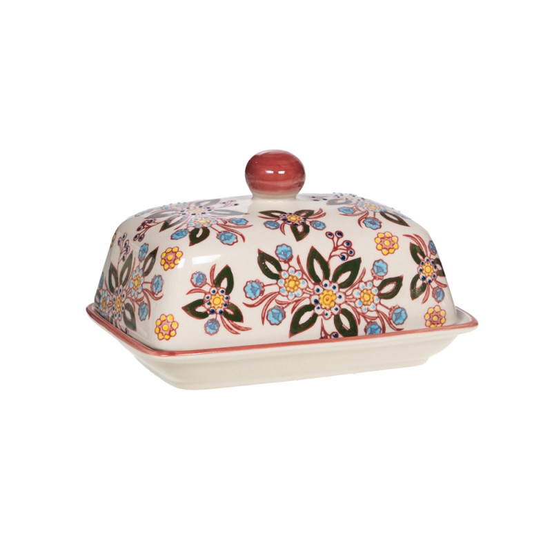 Découvrez le Beurrier Siena 16x11 cm de la gamme Siena, une création élégante et authentique signée Table Passion. Fabriqué en grès de haute qualité, ce beurrier allie robustesse et raffinement pour sublimer votre table au quotidien. Son design délicatement peint à la main, inspiré des motifs floraux traditionnels, apporte une touche chaleureuse et colorée à votre service. Sa forme rectangulaire avec un couvercle bombé et une poignée ergonomique garantit une utilisation pratique tout en protégeant votre beurre avec style.