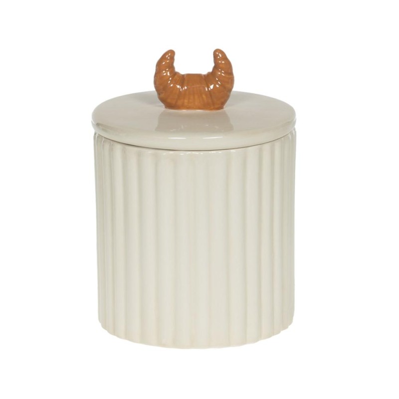 Apportez une touche gourmande et chaleureuse à votre cuisine avec cette boîte petit-déjeuner en céramique au charme irrésistible. Sa silhouette cannelée couleur crème, élégante et intemporelle, est sublimée par un couvercle délicatement orné d’un petit croissant brun, clin d’œil gourmand qui évoque les douceurs du matin. À la fois décorative et fonctionnelle, elle permet de conserver sucre, biscuits ou sachets de thé à l’abri de l’humidité. Compacte et robuste, elle trouve facilement sa place sur un plan de travail, une étagère ou dans un coin café, apportant une note conviviale et raffinée à votre intérieur. Un objet du quotidien qui allie avec subtilité praticité et plaisir des yeux.