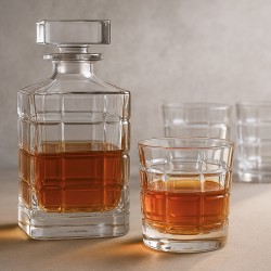 La carafe, au design épuré et aux lignes géométriques inspirées de la pierre taillée, est accompagnée de six verres assortis, parfaits pour partager un moment convivial entre amis ou en famille. Le motif gravé sur le verre apporte une texture unique et un jeu de lumière raffiné, sublimant chaque service.
