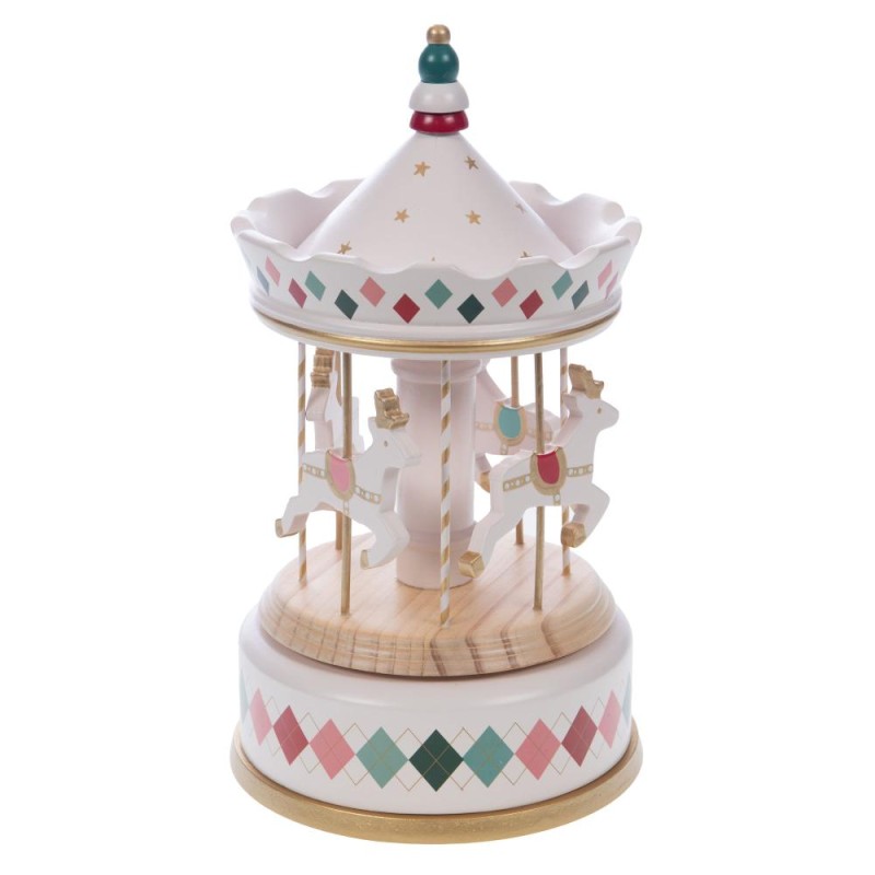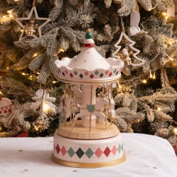Apportez une touche de féérie à vos décorations de fêtes avec ce grand carrousel de Noël en bois. Orné de rennes élégants et de détails peints aux couleurs traditionnelles, il évoque la magie des fêtes de fin d’année. Son design raffiné et ses finitions soignées en font une pièce décorative unique, idéale à poser près du sapin ou sur un meuble pour émerveiller petits et grands.