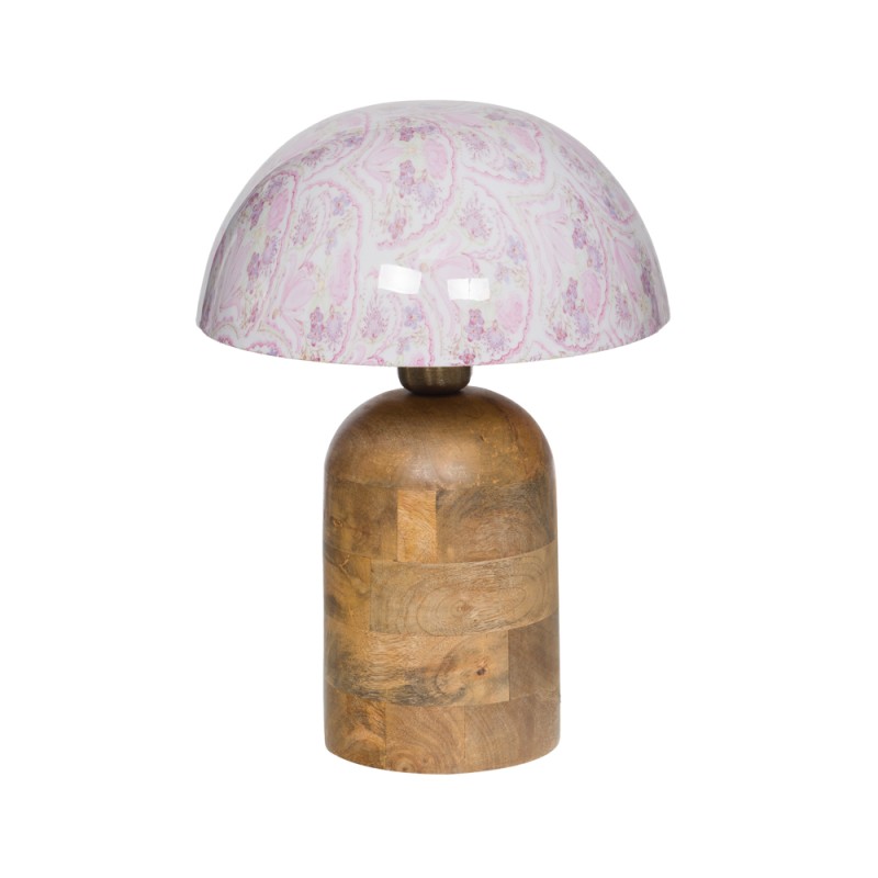 La collection Calista se distingue par ses motifs délicats dans des tons rosés sublimés de touches dorées. Elle apporte une touche chic, poétique et raffinée, transformant chaque pièce en un objet décoratif unique et élégant. Avec son pied en bois de manguier et son abat-jour en métal orné de motifs rosés et dorés, la grande lampe Calista incarne l’élégance raffinée et le charme poétique. Haute de 37 cm, elle diffuse une lumière chaleureuse et devient une véritable pièce décorative, idéale pour sublimer un salon, une chambre ou une entrée.
