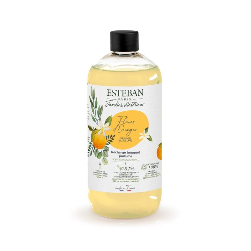 Plongez dans une bulle de douceur et de fraîcheur avec la recharge de parfum pour bouquet Fleurs d’Oranger Esteban, une fragrance emblématique qui évoque la lumière du Sud et les souvenirs d’enfance. Cette recharge 500 ml vous permet de prolonger le plaisir olfactif de votre bouquet parfumé tout en respectant la nature grâce à sa formule Vegan et certifiée biologique. Composée à 82% d’ingrédients issus de l’agriculture biologique, cette création aux extraits naturels diffuse à froid en continu, offrant une parfumation délicate et constante pendant 2 à 6 mois selon les conditions d’utilisation. Son alcool d’origine végétale provient également de l’agriculture biologique, garantissant une pureté et une authenticité incomparables. Le flacon en plastique 100% recyclé s’inscrit dans une démarche écoresponsable, fidèle aux engagements de la marque Esteban Paris Parfums. La senteur Fleurs d’Oranger dévoile un sillage frais et enveloppant : un bouquet floral aux accents poudrés qui évoque une promenade dans une agrumeraie provençale baignée de soleil. Les fleurs blanches et dorées du bigaradier libèrent un parfum à la fois tendre et lumineux, empreint de candeur et de joie. Avec la recharge Fleurs d’Oranger Esteban, offrez à votre intérieur une atmosphère apaisante et raffinée, empreinte de naturel, de pureté et de sérénité.
