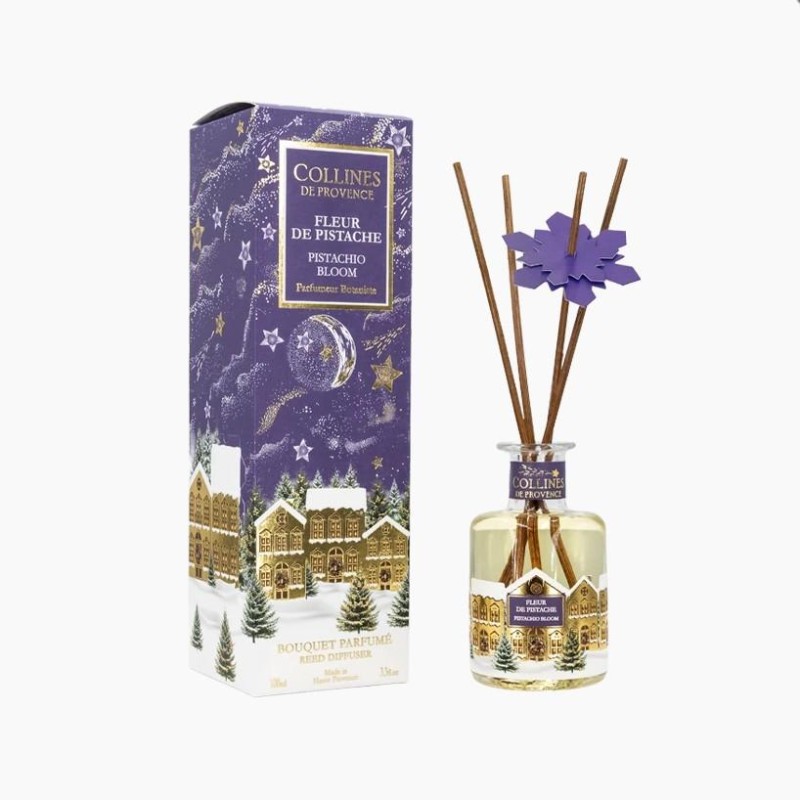 Laissez la magie de Noël s’inviter chez vous avec le bouquet parfumé Fleur de Pistache 100 ml signé Collines de Provence. Habillé d’un élégant flacon violet sublimé de dorures festives, ce diffuseur de parfum incarne à la perfection l’esprit des fêtes : raffinement, chaleur et gourmandise. Ses tiges naturelles diffusent en continu une fragrance orientale et sucrée, où la pistache s’exprime avec délicatesse, évoquant de doux souvenirs d’enfance et des moments de convivialité. Le bouquet parfumé Fleur de Pistache offre un équilibre subtil entre douceur et fraîcheur, enveloppant votre intérieur d’une atmosphère féérique et réconfortante. Sa note de pistache, à la fois croquante et fondante, dégage une senteur délicatement sucrée qui séduit par sa douceur irrésistible et son caractère raffiné. Idéal comme décoration parfumée ou cadeau de Noël élégant, ce bouquet parfumé transforme chaque pièce en un cocon chaleureux et festif. Un véritable écrin de gourmandise et de raffinement, parfait pour prolonger la magie de Noël tout au long de l’hiver.