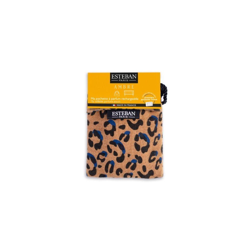 Apportez une touche d’élégance et de parfum à votre quotidien avec la pochette Léopard parfumée Ambre. Confectionnée en gaze de coton douce et légère, cette petite pochette renferme une céramique parfumée à cœur, fabriquée et parfumée avec soin dans les ateliers Esteban en France. Idéale pour diffuser délicatement son parfum dans vos sacs à main, sacs de sport, tiroirs ou petites armoires, elle libère progressivement une fragrance raffinée et chaleureuse. Grâce à sa céramique rechargeable à l’infini avec les recharges Esteban, elle vous accompagne durablement. Le parfum Ambre s’ouvre sur la fraîcheur lumineuse de la bergamote, avant de révéler des notes chaudes et sophistiquées. Son sillage se termine sur un cœur doux et enveloppant de vanille, mêlant harmonieusement des accords boisés et vanillés pour une ambiance chaleureuse et élégante.