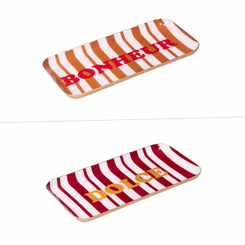 Disponible en deux modèles raffinés : “Bonheur” et “Dolce, ce plateau en métal séduit par son design coloré et moderne, idéal pour sublimer vos moments de partage.
