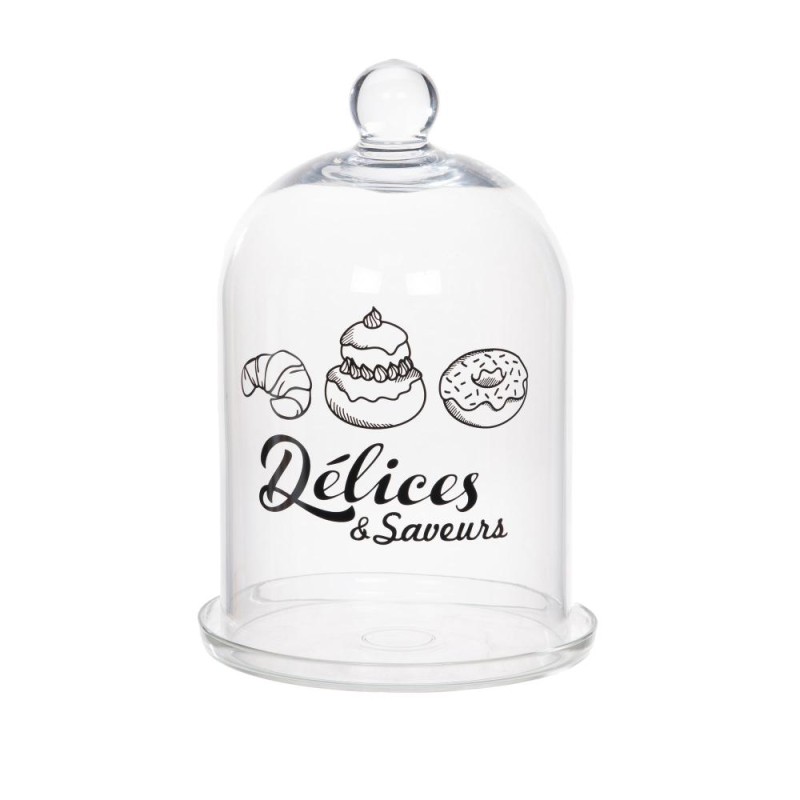 Mettez en valeur vos gourmandises avec élégance grâce à cette cloche en verre « Délices & Saveurs ». Son design transparent offre une parfaite visibilité de vos pâtisseries, fromages ou créations décoratives, tout en les protégeant de la poussière. Dotée d’un dôme généreux et d’un plateau assorti, elle allie praticité et esthétisme. Son motif imprimé apporte une touche gourmande et conviviale, idéale pour sublimer une table, un buffet ou un plan de travail. Un indispensable aussi décoratif que fonctionnel pour une présentation soignée au quotidien.