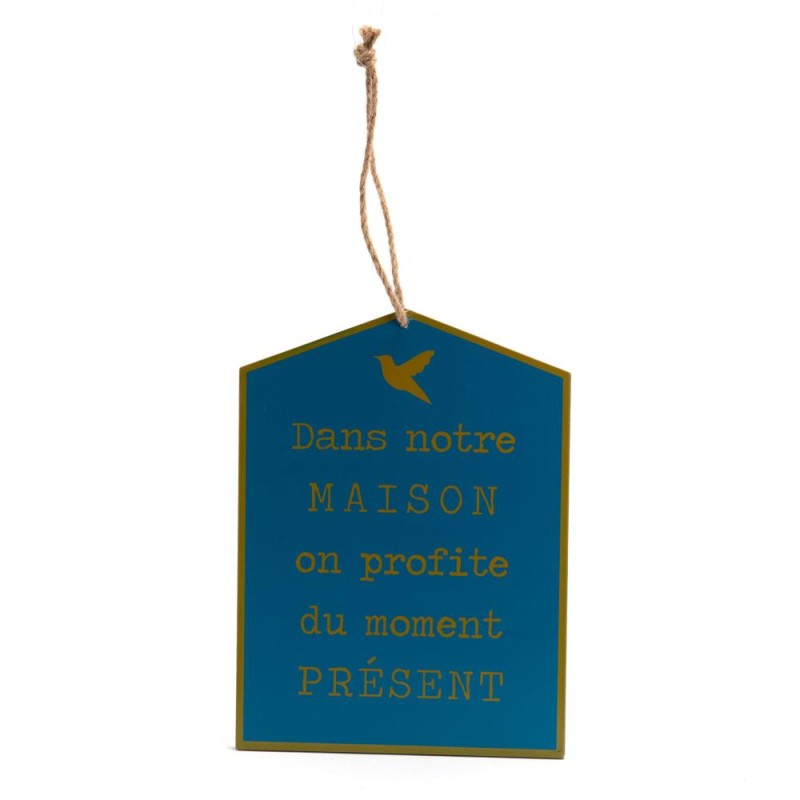 Apportez une note chaleureuse à votre intérieur avec cette plaque décorative en bois au message inspirant. Son fond bleu profond et ses lettres dorées illuminent vos murs, tandis que sa cordelette naturelle facilite son installation. Un petit détail qui invite à profiter pleinement du moment présent, pour une ambiance cosy et positive chez vous.