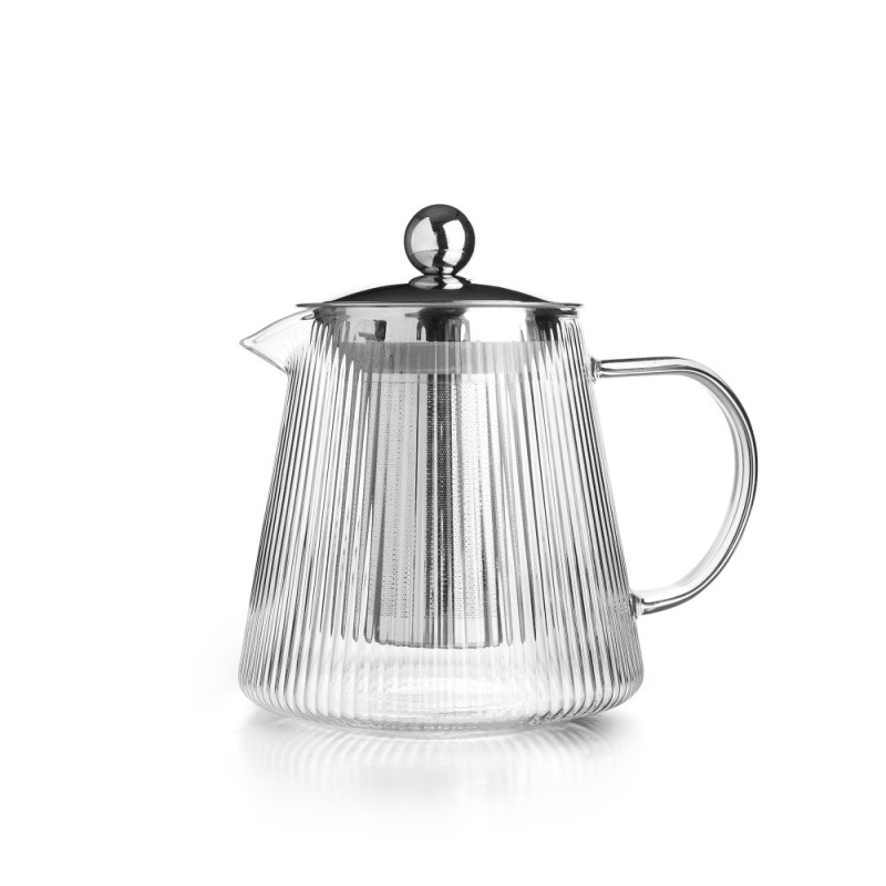 Théière élégante en verre soufflé 1200 ml, design cannelé apportant une finition premium et une bonne prise en main visuelle. Équipée d'un couvercle et d'une anse ergonomique en métal inoxydable et d'un infuseur amovible en acier inox micro-perforé, elle convient à la vente en cuisine et accessoires maison. Produit photogénique, facile à mettre en valeur en catalogue : bonne marge, entretien simple et cible large (cadeaux, art de la table).